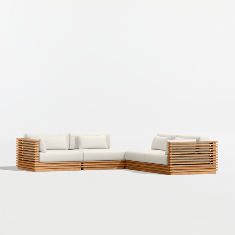 Modern and made for the outdoors, Batten's modular design flexes with your space and entertaining style. Crafted of sustainably sourced, unfinished solid teak, it is built to last a lifetime. The sectional's bold slats, striking linear profile and minimalist silhouette give it a distinctly modern look. A cozy mix of plush seat, back and lumbar cushions plus throw pillows provides unrivaled comfort and can all be upholstered in a weather-resistant fabric of your choice.