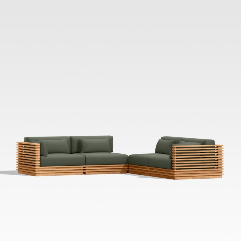 Modern and made for the outdoors, Batten's modular design flexes with your space and entertaining style. Crafted of sustainably sourced, unfinished solid teak, it is built to last a lifetime. The sectional's bold slats, striking linear profile and minimalist silhouette give it a distinctly modern look. A cozy mix of plush seat, back and lumbar cushions plus throw pillows provides unrivaled comfort and can all be upholstered in a weather-resistant fabric of your choice.