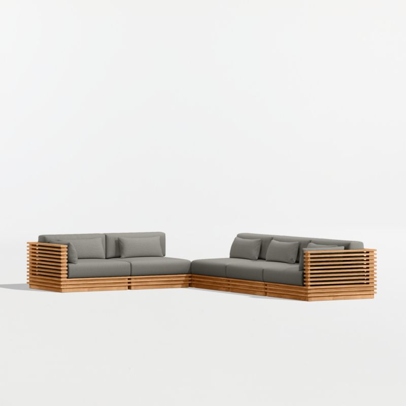 Modern and made for the outdoors, Batten's modular design flexes with your space and entertaining style. Crafted of sustainably sourced, unfinished solid teak, it is built to last a lifetime. The sectional's bold slats, striking linear profile and minimalist silhouette give it a distinctly modern look. A cozy mix of plush seat, back and lumbar cushions plus throw pillows provides unrivaled comfort and can all be upholstered in a weather-resistant fabric of your choice.