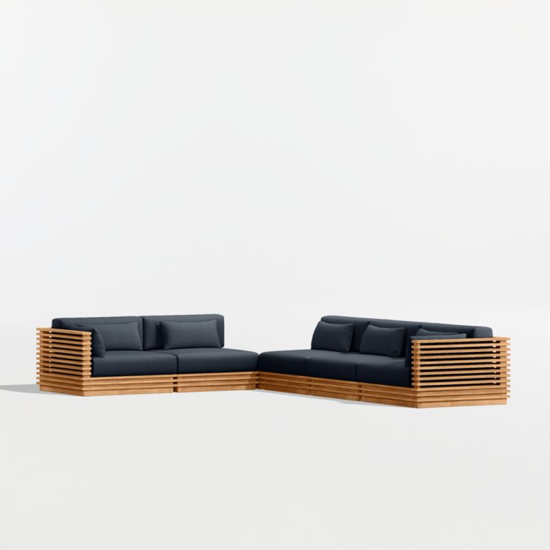 Modern and made for the outdoors, Batten's modular design flexes with your space and entertaining style. Crafted of sustainably sourced, unfinished solid teak, it is built to last a lifetime. The sectional's bold slats, striking linear profile and minimalist silhouette give it a distinctly modern look. A cozy mix of plush seat, back and lumbar cushions plus throw pillows provides unrivaled comfort and can all be upholstered in a weather-resistant fabric of your choice.