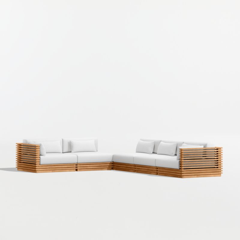 Modern and made for the outdoors, Batten's modular design flexes with your space and entertaining style. Crafted of sustainably sourced, unfinished solid teak, it is built to last a lifetime. The sectional's bold slats, striking linear profile and minimalist silhouette give it a distinctly modern look. A cozy mix of plush seat, back and lumbar cushions plus throw pillows provides unrivaled comfort and can all be upholstered in a weather-resistant fabric of your choice.
