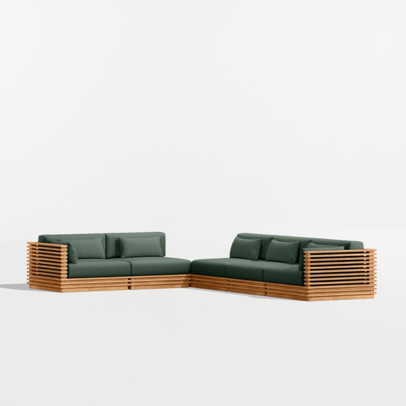 Modern and made for the outdoors, Batten's modular design flexes with your space and entertaining style. Crafted of sustainably sourced, unfinished solid teak, it is built to last a lifetime. The sectional's bold slats, striking linear profile and minimalist silhouette give it a distinctly modern look. A cozy mix of plush seat, back and lumbar cushions plus throw pillows provides unrivaled comfort and can all be upholstered in a weather-resistant fabric of your choice.
