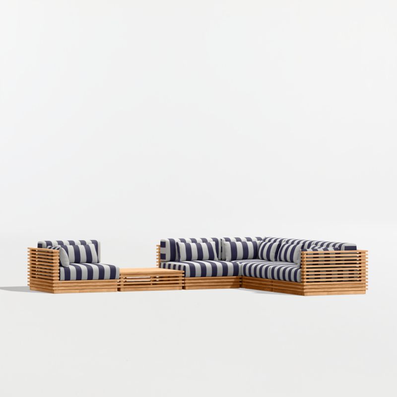 Batten Natural Teak 6-Piece L-Shaped Outdoor Sectional Sofa with Side Coffee Table & Navy and White Cabana Stripe Sunbrella ® Cushions