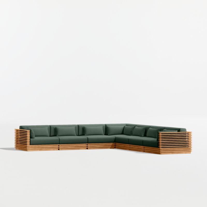 Modern and made for the outdoors, Batten's modular design flexes with your space and entertaining style. Crafted of sustainably sourced, unfinished solid teak, it is built to last a lifetime. The sectional's bold slats, striking linear profile and minimalist silhouette give it a distinctly modern look. A cozy mix of plush seat, back and lumbar cushions plus throw pillows provides unrivaled comfort and can all be upholstered in a weather-resistant fabric of your choice.