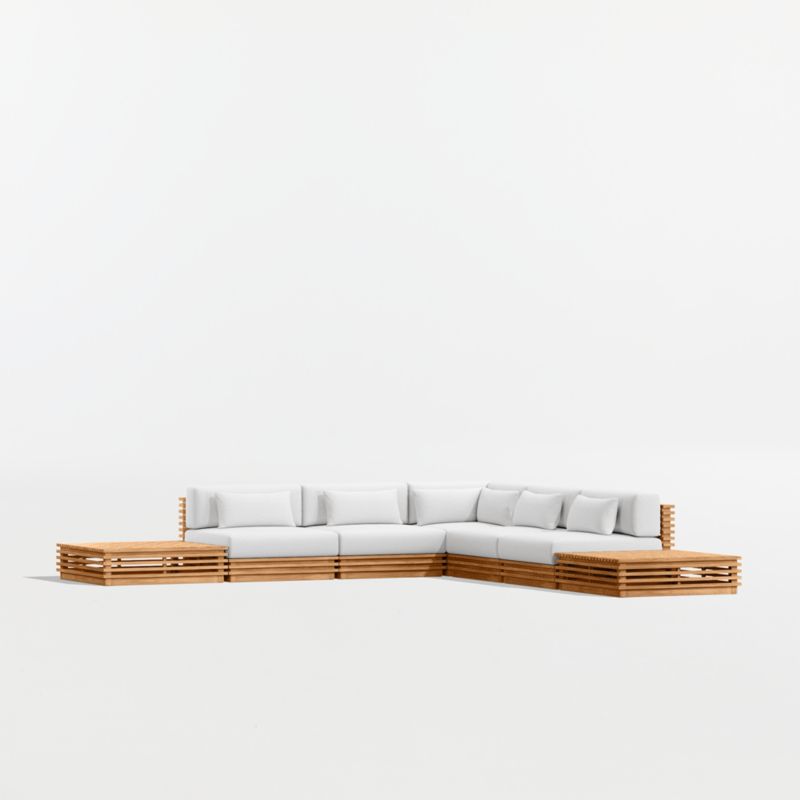Modern and made for the outdoors, Batten's modular design flexes with your space and entertaining style. Crafted of sustainably sourced, unfinished solid teak, it is built to last a lifetime. The sectional's bold slats, striking linear profile and minimalist silhouette give it a distinctly modern look. A cozy mix of plush seat, back and lumbar cushions plus throw pillows provides unrivaled comfort and can all be upholstered in a weather-resistant fabric of your choice.
