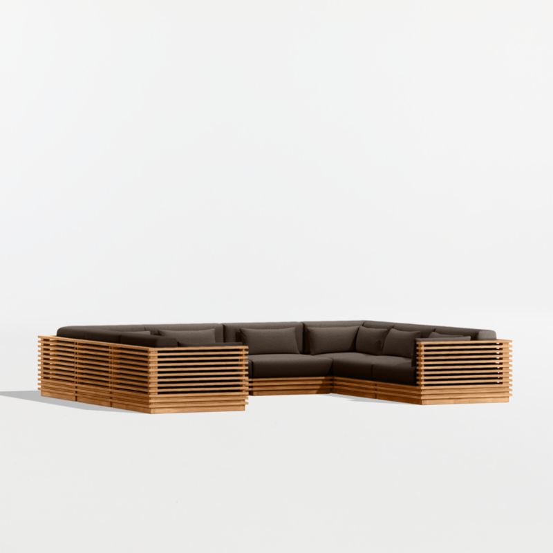 Modern, modular and made for the outdoors, our Batten sectional riffs on our popular indoor storage and bed collection to outfit your alfresco living space with clean lines and real teak. The bold slats of sustainable teak that define the linear profile and minimalist silhouette of the components—right- and left-arm chairs, four armless chairs and two corners—line up seamlessly to form the U-shaped sectional. Layered with seat, back, lumbar and pillow cushions covered in UV-resistant acrylic, the eight-piece sectional sits deep and comfortable day into night.