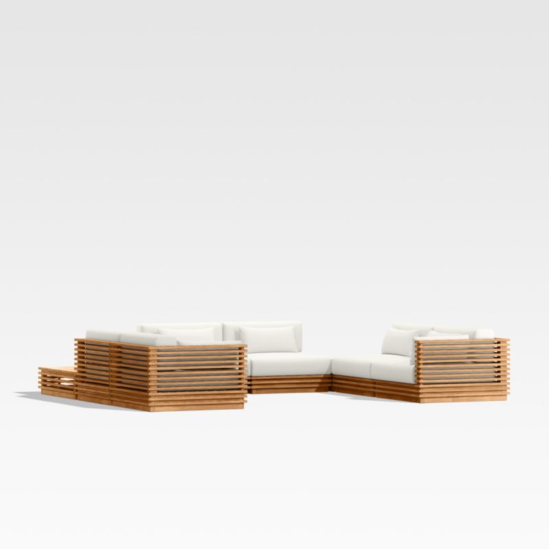Modern and made for the outdoors, Batten's modular design flexes with your space and entertaining style. Crafted of sustainably sourced, unfinished solid teak, it is built to last a lifetime. The sectional's bold slats, striking linear profile and minimalist silhouette give it a distinctly modern look. A cozy mix of plush seat, back and lumbar cushions plus throw pillows provides unrivaled comfort and can all be upholstered in a weather-resistant fabric of your choice.