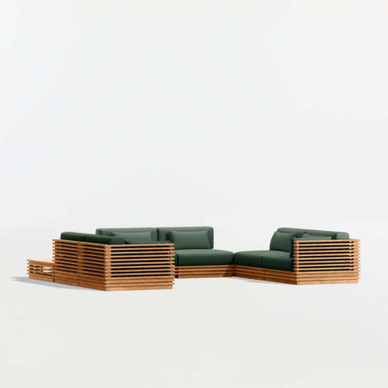 Modern and made for the outdoors, Batten's modular design flexes with your space and entertaining style. Crafted of sustainably sourced, unfinished solid teak, it is built to last a lifetime. The sectional's bold slats, striking linear profile and minimalist silhouette give it a distinctly modern look. A cozy mix of plush seat, back and lumbar cushions plus throw pillows provides unrivaled comfort and can all be upholstered in a weather-resistant fabric of your choice.