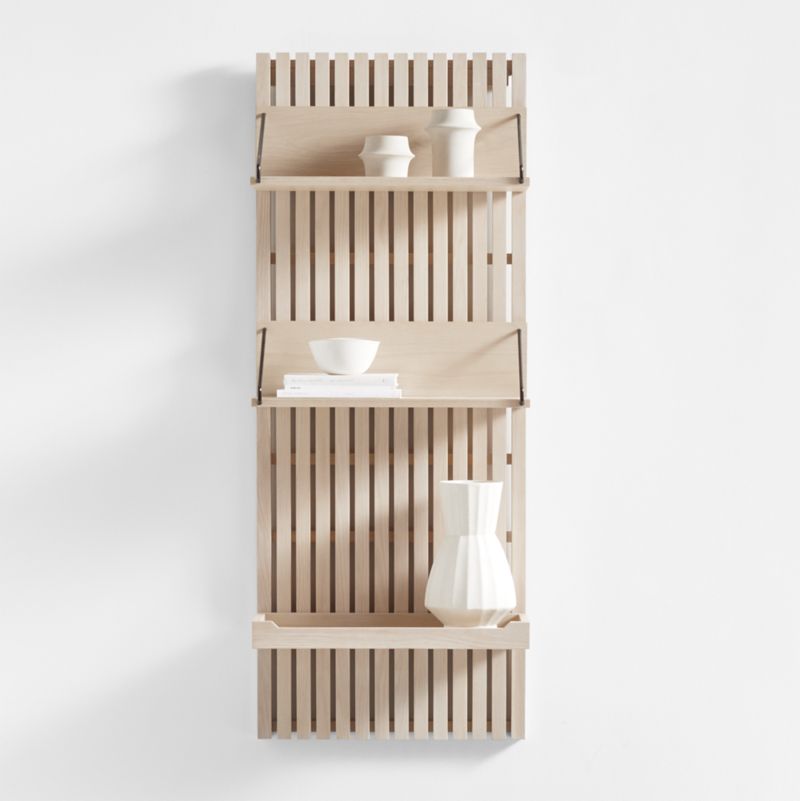 Our Batten collection is a modular home storage solution that makes the most of wall space. We've put together this configuration to maximize storage in a pantry, home office, walk-in closet or any space in need of tidying. Each piece showcases beautiful oak veneer and is finished in white oak. A vertically slatted back panel mounts on the wall to provide a backdrop for affixing three shelves—one flat and two reversibles that can be hung with brackets on top or underneath to give you lots of storage options.