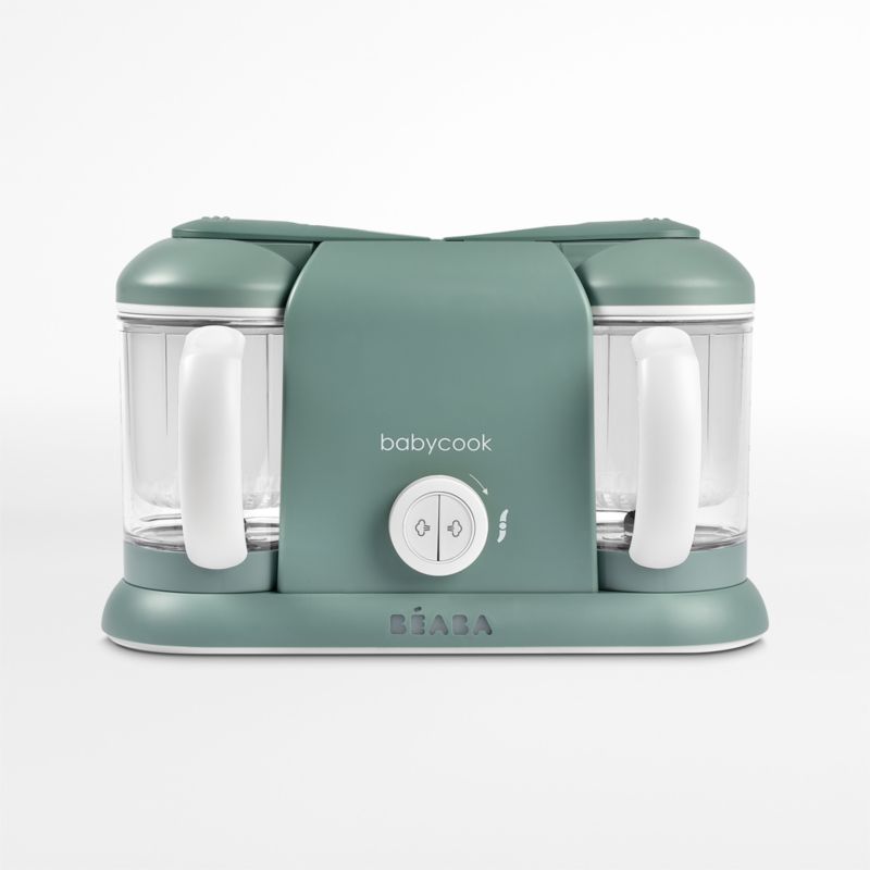 Make two types of homemade baby food at once in this innovative four-in-one appliance that steams, blends, defrosts and reheats. Preparing up to nine cups of food at once, the Babycook Duo steams raw chicken, fish, veggies and fruits in less than 20 minutes, then purees them to your desired consistency using the nutrient-packed steaming liquid. Accented in fresh white, the eucalyptus green baby food maker offers one-handed operation, auto shut-off for worry-free cooking and dishwasher-safe cleanup.