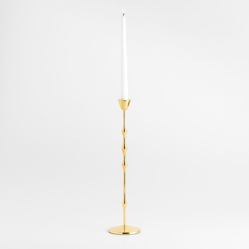 Our take on traditional ornate candlesticks, this taper holder stretches and streamlines the classic silhouette into something sculptural and abstract. Crafted of cast brass, the candlestick evokes a stream of molten gold. We especially love the way candlelight gleams on the highly polished finish. Pair the large beaded taper holder with the smaller coordinating candlesticks to set the table with modern glam.