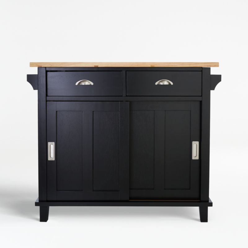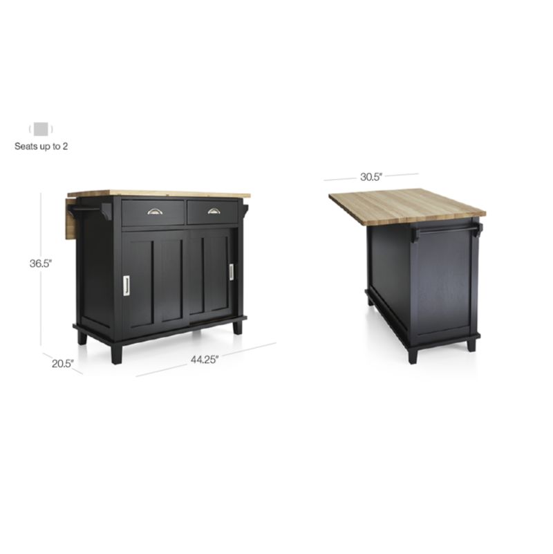 Designed by Bill Eastburn of William Eastburn Design, this kitchen island is equipped with 2 generous drawers, a sliding door cabinet with an adjustable shelf, and 2 towel bars. Convenient optional casters (sold separately) keep it right at hand and make it easy to move or store. Accommodates counter stools when leaf is up. The Belmont Kitchen Island is a Crate and Barrel exclusive.