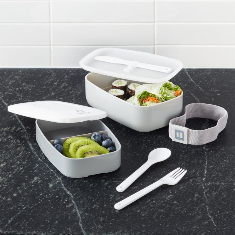 Pack your lunch in style in a stackable lunch box that's practical and pleasingly minimalist in chic greys and white. Inspired by the divided Japanese Bento box, this set is easy to pack and far more pleasant to use than disposable containers and paper bags. This all-in-one kit includes one dark grey divided container with a lid that stacks atop a light grey lidded container. A knife, fork and spoon fit snugly between the two, with a sturdy strap to keep all pieces secured on the go.