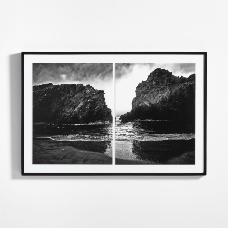 Made by the Los Angeles artist collective Gold Rush Art Co., this photography diptych combines two views of California's Big Sur coast into one dynamic composition. Dominated by inky blacks, deep greys and shape-defining whites, the black-and-white photographs bring even more drama to the spectacular rock formations of this celebrated site. The two self-matted photos are presented under acrylic glass in a slim black-finished wood frame.