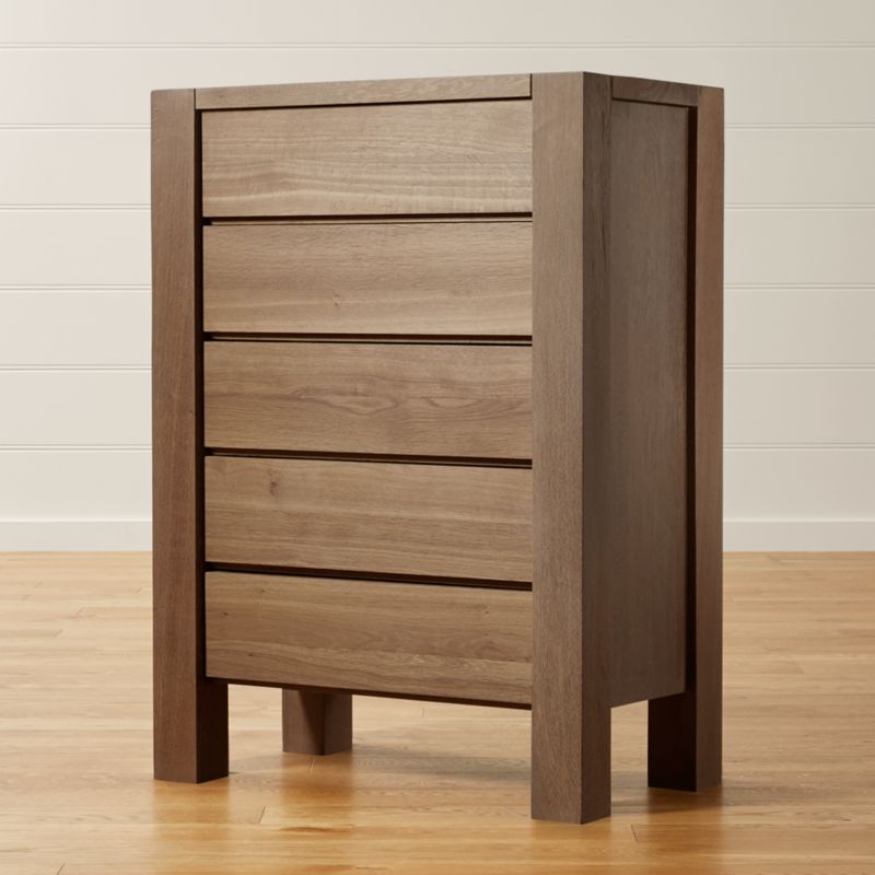 Integrated legs frame the chest with single pieces of heartwood, the strongest part of the tree. Five drawers stack providing ample storage. Each piece will vary, exhibiting its own unique markings adding its natural allure. The Big Sur Smoke 5-Drawer Chest is a Crate and Barrel exclusive.
