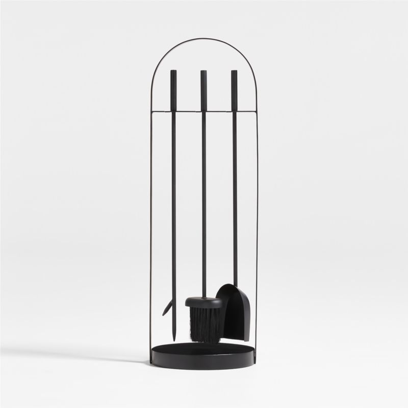 Our tool set updates fireplace essentials with clean curves and a modern matte black finish. Framed in a simple arch, the set suspends a poker, brush and shovel over a round base. The cylindrical handles of the tools continue the rounded theme to create a cohesive look. Hand-welded by skilled artisans, our black arch fireplace tools are Crate & Barrel exclusives.