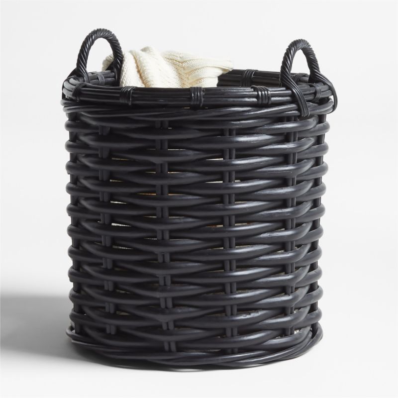 Heated until pliable, sustainable rattan weaves a simple and elegant round basket. Two twisted handles provide convenient handholds for carrying, and the matte black finish is understated and sophisticated. Our exclusive black rattan basket neatly corrals everything from toys to decorative pillows or serves as a modern organic cachepot for a potted plant.