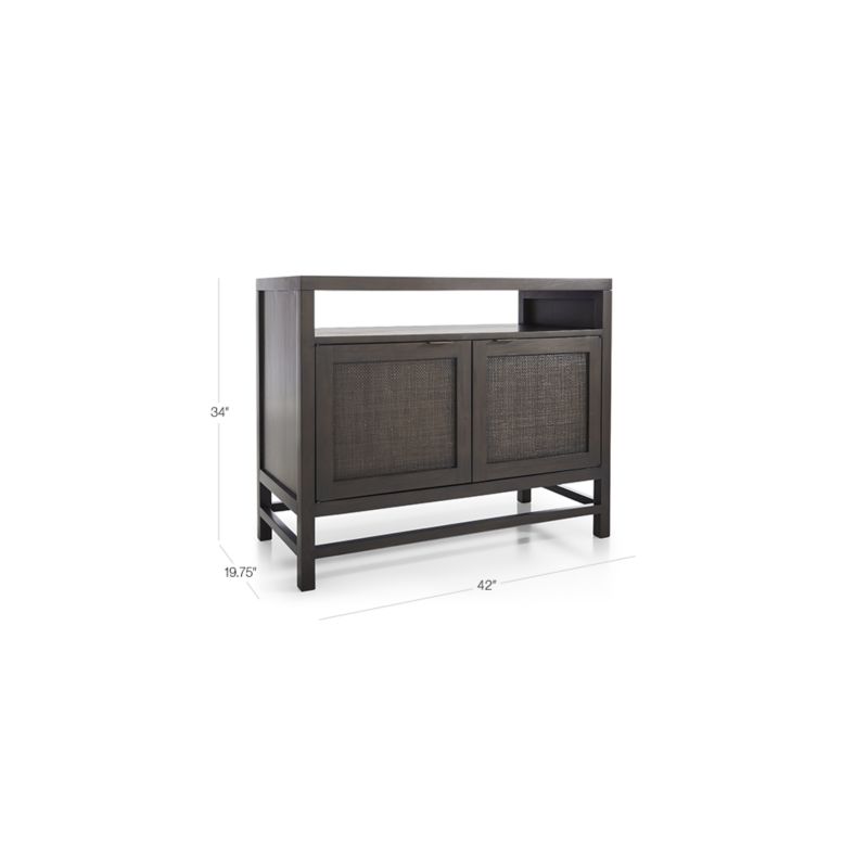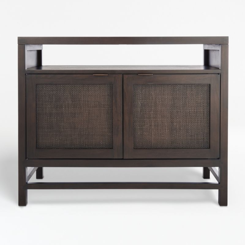 The compact console, finished in dark brown, opens to an adjustable shelf with an open shelf on top. The Blake Dark Brown 42" Media Storage Console is a Crate & Barrel exclusive.