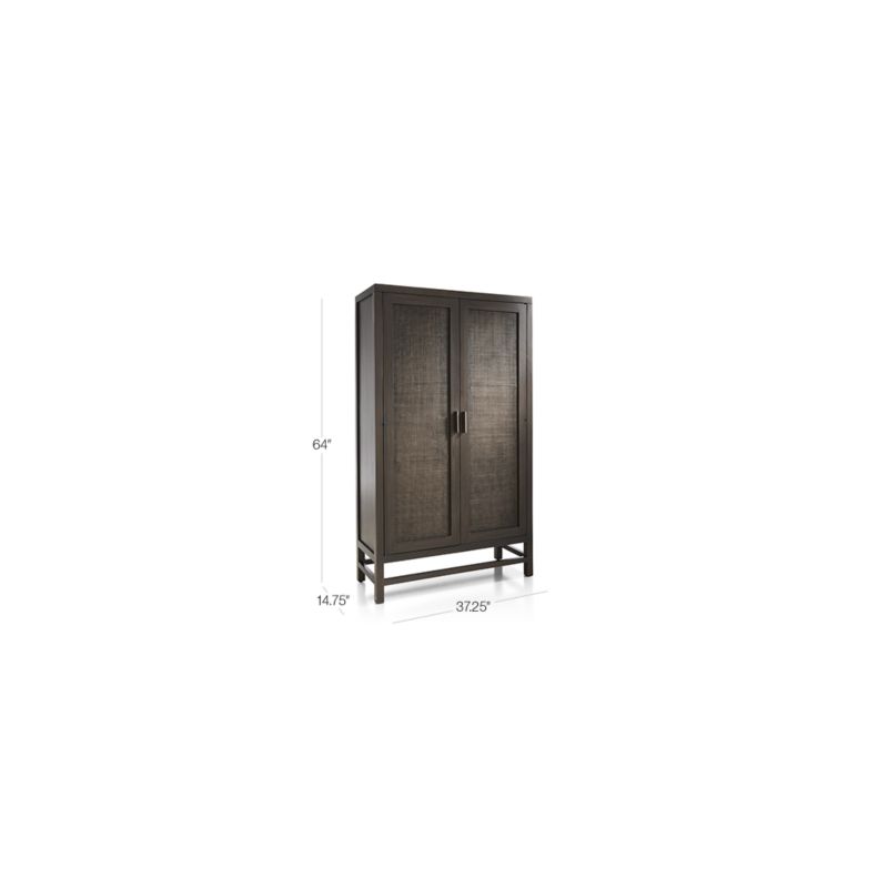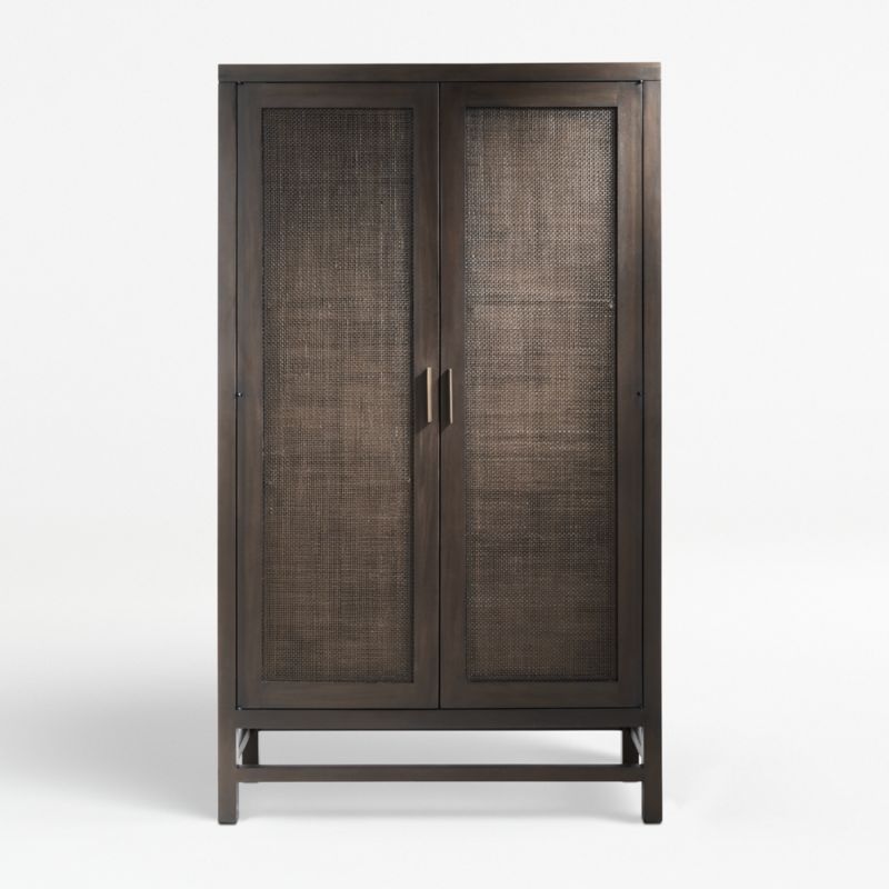 Finished in dark brown and accented with antique brass pulls, the cabinet has double doors that open to one fixed and two adjustable shelves to accommodate dinnerware, office supplies or electronics. Cord cutouts and a sliding panel provide cord management. The Blake Dark Brown 2-Door Cabinet is a Crate & Barrel exclusive.