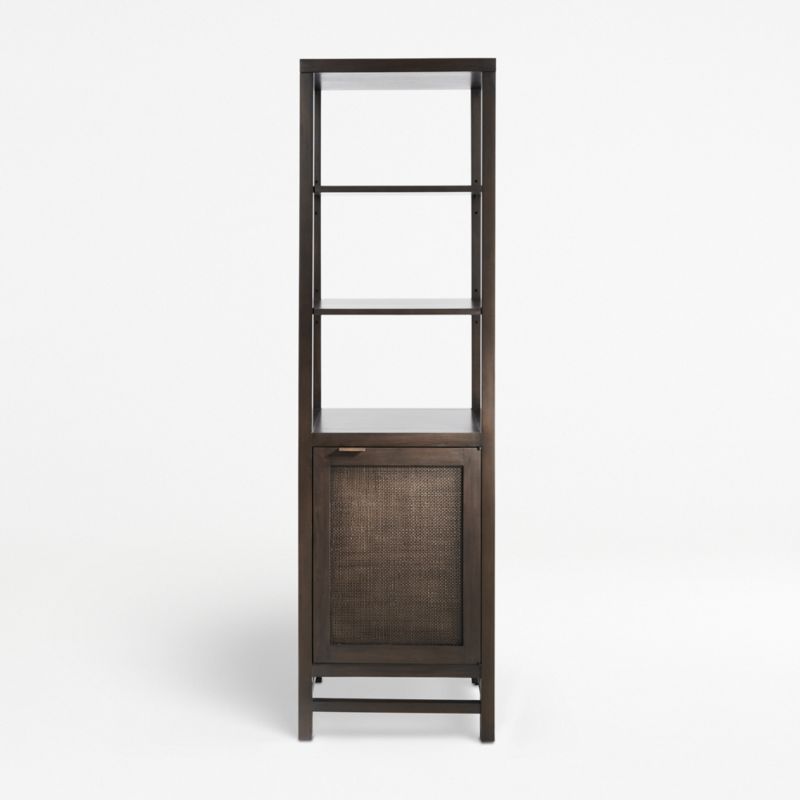 Finished in dark brown, this tall cabinet provides open storage with two adjustable shelves with another shelf inside. The Blake Dark Brown Tall Cabinet is a Crate and Barrel exclusive.