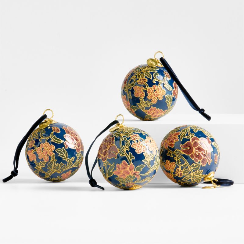 Inspired by the art of cloisonne—designs made out of colored enamel delineated with copper wires—our ornament boasts the same intricate details and glowing colors. Skilled artisans paint the metal sphere by hand, creating a floral swirl of pink and green against a sapphire blue backdrop. Textural gold outlines highlight every petal and leaf. This gorgeous ornament suits a formal tree with Old World glamour.