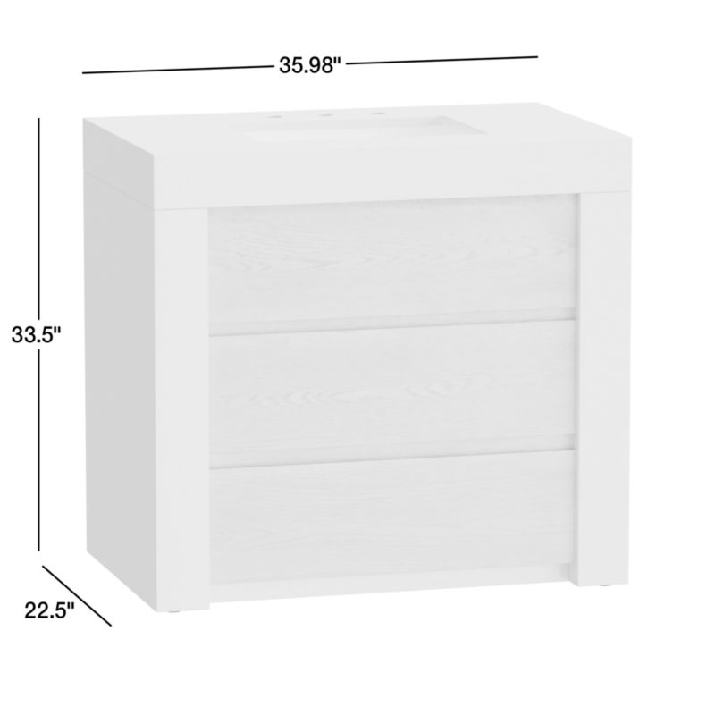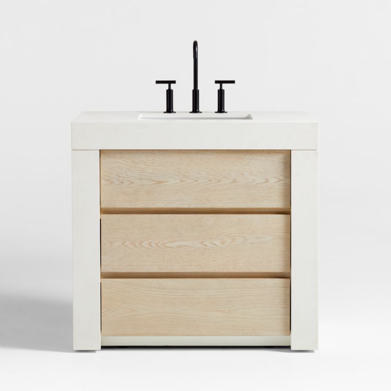 Give your bathroom an instant contemporary update with our Bluff vanity. Slabs of off-white quartz craft the monolithic silhouette, framing solid ash and oak veneer drawers. Flat fronts contribute to the cabinet's minimalist vibe, while wire brushing and a light bleached finish draw attention to the striking linear grain. Finger pulls open two drawers with white interiors—one full-width and one divided and U-shaped to maximize storage around sink plumbing. A faux fixed-drawer panel above continues the look. Ready for your choice of faucet (sold separately), the vanity features a rectangular cutout for the white ceramic undermount sink. Easy to install and built to last, the Bluff single vanity is a Crate & Barrel exclusive.