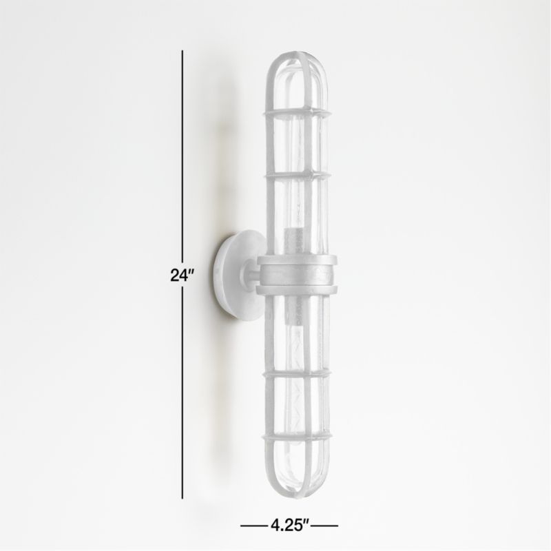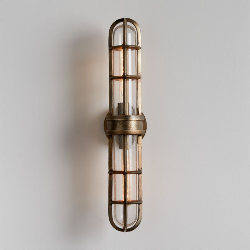 Our Boathouse wall sconce designed by Leanne Ford captures the beautifully weathered mystery of an antique find. Artfully textured and perfectly imperfect, the brass-finished cage encompases a tube of thick glass animated by waves and bubbles. Washing the wall with light, our exclusive cage wall sconce brings the coziness and well-traveled aesthetic of a historic boathouse bar to the modern home. Install a few of the lights down a hallway to set a welcoming mood. This piece is part of our exclusive collaboration with star designer Leanne Ford. Curated and crafted around the world, the collection brings Leanne's cool, effortless vibe home to you.