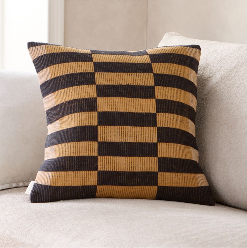 Handwoven of Ethiopian cotton, this graphic pillow delights with an optical arrangement of stripes in tonal tan and black. The pillow reverses to the same and is neatly tailored with knife edges and a nearly invisible zipper. A plush microfiber insert is included.