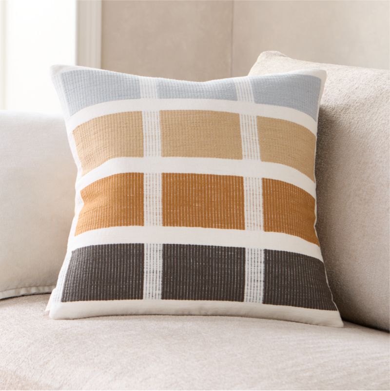 Handwoven of Ethiopian cotton, this pillow frames rectangles of grey, black and tonal tan in ivory to create a grid with graphic punch. The pillow reverses to the same and is neatly tailored with knife edges and a nearly invisible zipper. A plush microfiber insert is included.