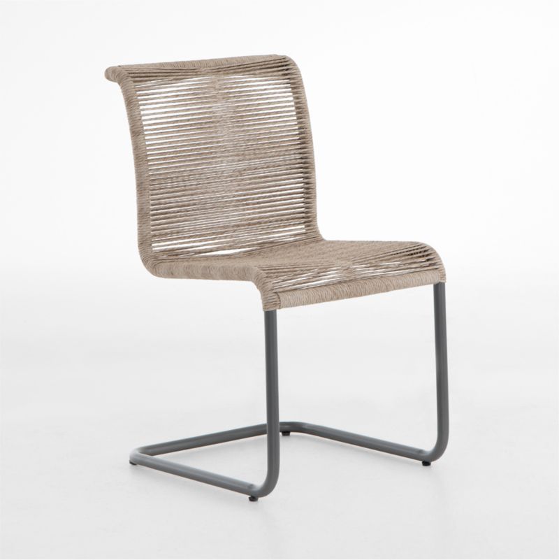 Borrowing from modern architecture, Boon bends a gravity-defying cantilever design. Gunmetal-finished iron tubing flows the L-shaped chair with contemporary curves. Linear webbing made of all-weather wicker in vintage white supports and conforms with your every move, springing back to its streamlined shape. Our Boon wicker dining chairs bring modern seating to our metal or wood outdoor dining tables.