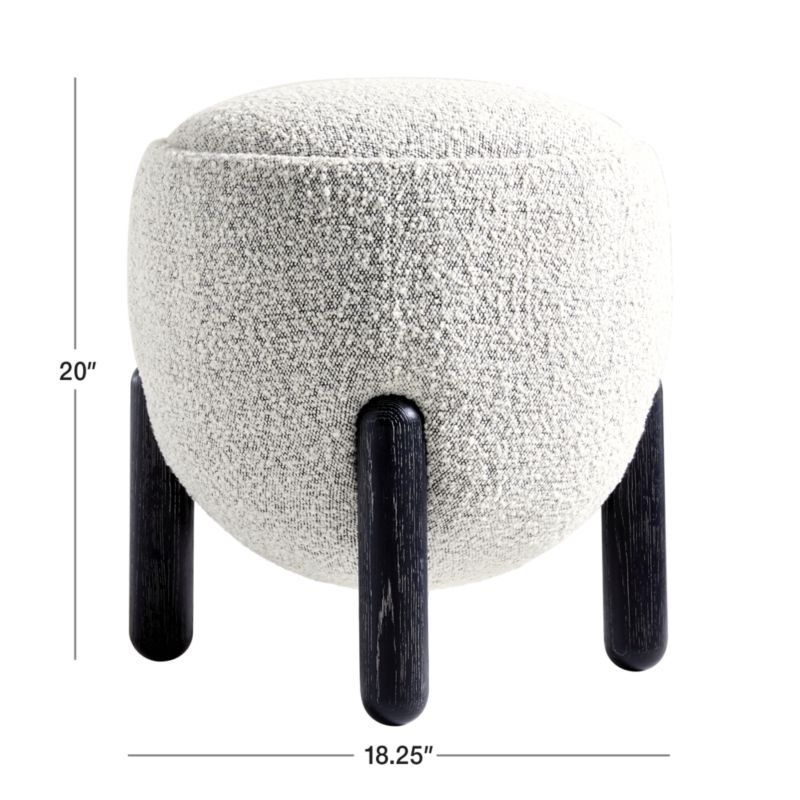Playful Borrego has some fun reimagining the classic ottoman. The drum-shaped seat nestles between exposed round legs, which are lightly wire brushed for texture and cerused to bring out the wood grain. Upholstered in a chunky weave of white bouclé and black yarns, the fabric adds contrast along with eye-catching texture. Great on its own, our Borrego ottoman looks amazing in multiples.