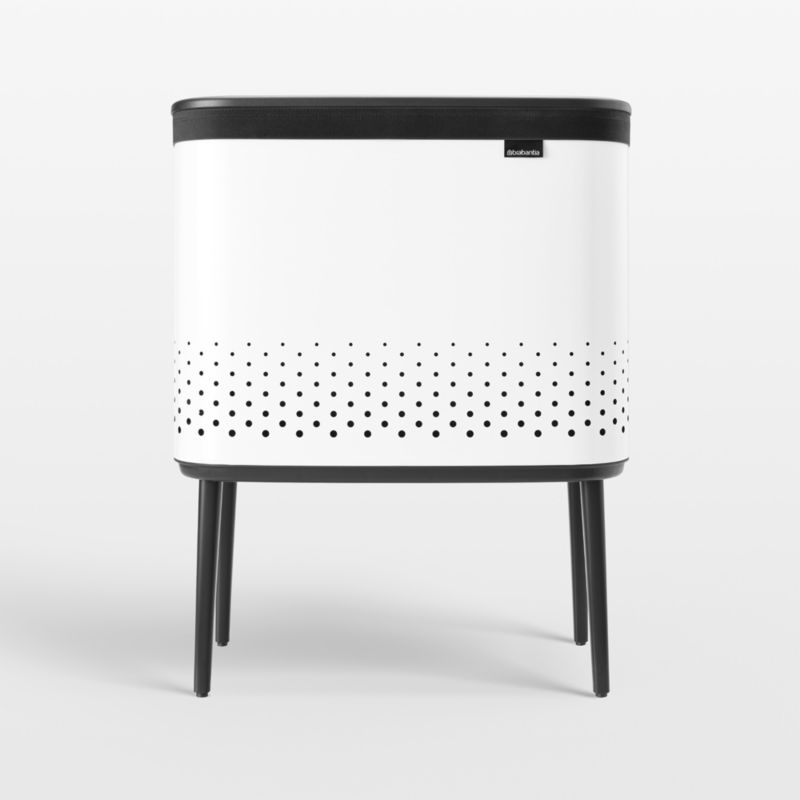 Store laundry in style in this sleek, streamlined hamper. Complemented by black legs and lid for a graphic look, the white-finished steel is perforated in a pleasing pattern that also provides ventilation. Those slender legs elevate the bin to a comfortable height, and the low-profile bin fits right against a bathroom, laundry room or bedroom wall. Detailed with indentations that subtly continue the dot motif, the lid offers a quick-drop opening. A grey cotton laundry bag with a velcro closure fits perfectly in the hamper, holding laundry and toting it conveniently to the washing machine or laundromat.