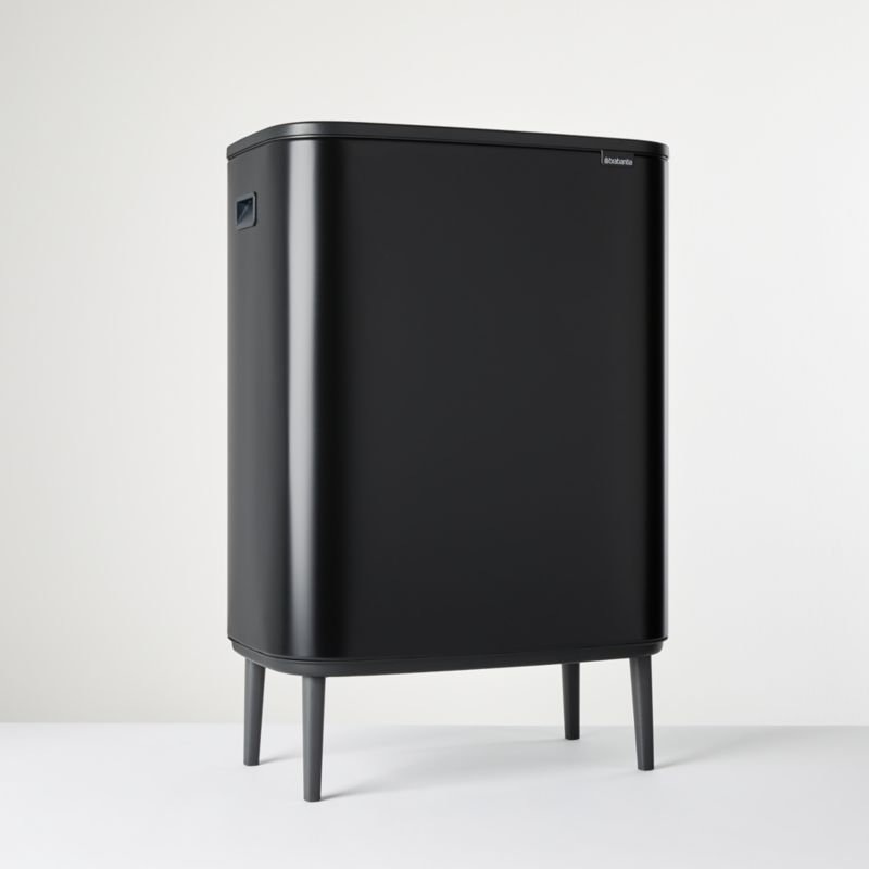 With all the style and charm of a vintage cooler, this modern matte black unit conceals two large buckets that sort your household waste. Use one for paper and one for plastic, or one for recyclables and the other for compost. The chic bin looks professional enough for a home office, where one bucket could hold papers to be recycled and other items to be shredded. Slender legs elevate the steel waste container to reduce the need to bend over. They are adjustable and non-slip to accommodate and protect all types of floors. A soft-touch mechanism opens and closes silently, and the lid holds itself open until you're ready to close it.