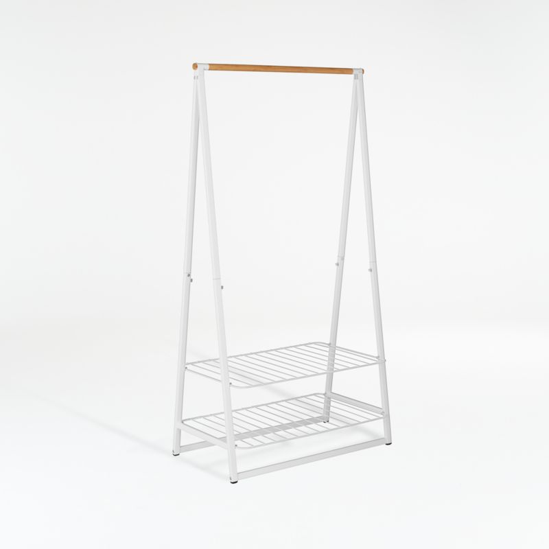 With two adjustable shelves and a sturdy horizontal rod, this rack holds clothes and accessories in style. Glossy white powder-coated steel joins gorgeous natural bamboo for a storage essential with minimalist, Scandi appeal. The bamboo rod holds up to 28 items on hangers, whether ready to wear or air drying, with longer items hanging between the wire shelves. Those white shelves are adjustable for optimal, flexible storage, holding bins, folded clothes, hats and shoes. Attractive enough to display in a modern bedroom, this versatile rack also adds utility to a bathroom, laundry room or mudroom.