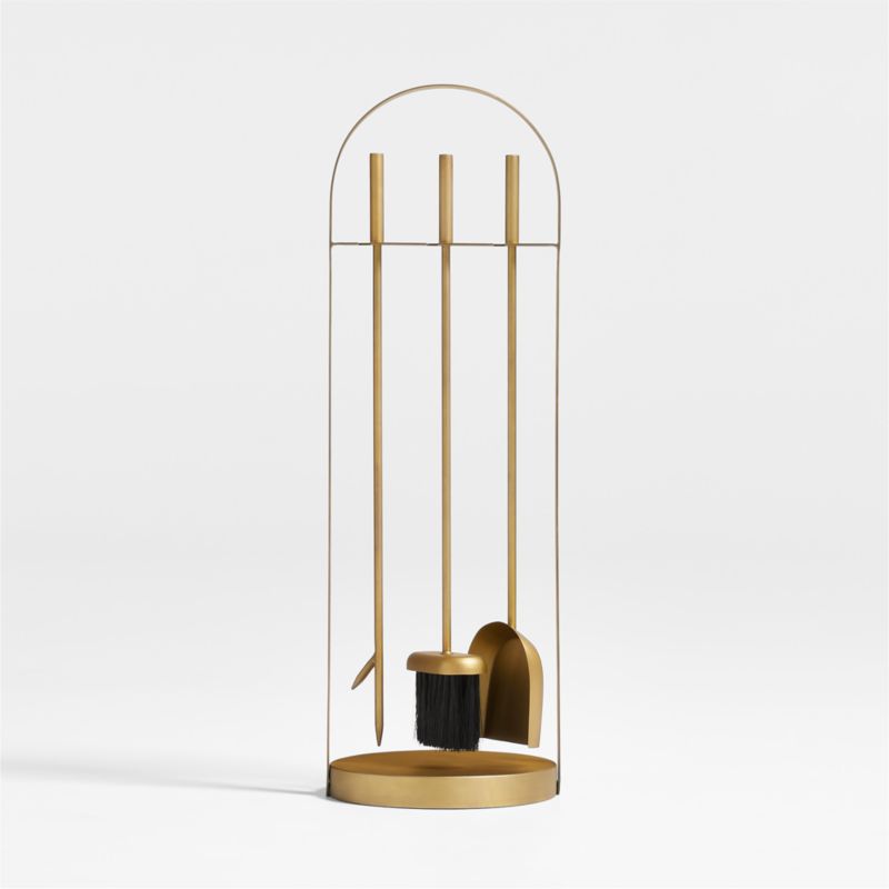 Our tool set upgrades fireplace essentials with clean curves and an antique brass finish. Framed in a simple arch, the gleaming set suspends a poker, brush and shovel over a round base. The handles of the tools mimic the frame design to create a cohesive look. Hand-welded by skilled artisans, our black arch fireplace tools are Crate & Barrel exclusives.