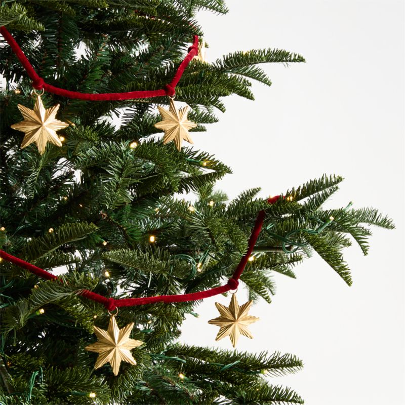 Our gleaming star garland festoons your mantel, tree or doorway with the texture and shine. The swag strings brass-finished faceted stars on red velvet ribbon for a luxe, classic look. Our exclusive garland also makes a charming presentation woven among candles on a holiday dining table.
