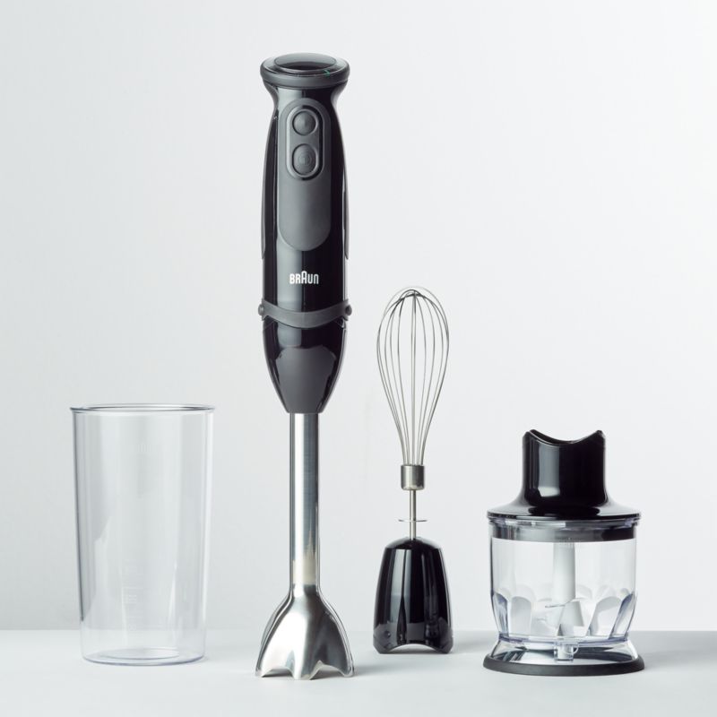 This streamlined blending system combines an immersion blender, hand mixer and food processor in one endlessly handy gadget. The powerful motor powers whisk and purée attachments with 21 speeds and an easy one-hand operation. Make perfectly smooth soups, smoothies and mayonnaise in the lidded measuring beaker, or blend, whip and purée right in your pot, bowl or pitcher. The motor body also powers the chopper, creating a handy mini-food processor perfectly suited to chopping onions, garlic, nuts, carrots, herbs and more. A completely sealed motor body makes for easy cleanup and ensures no food makes its way into the works, while all other parts are dishwasher-safe.