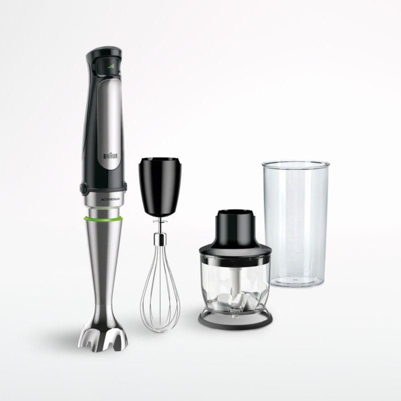 This streamlined blending system combines an immersion blender, hand mixer and food processor in one endlessly handy gadget. The powerful motor powers stainless steel whisk and purée attachments with easy one-hand operation and intuitive speed control—simply press the button harder to increase the speed. Make perfectly smooth soups, smoothies and mayonnaise in the lidded measuring beaker, or blend right in your pot, bowl or pitcher. An extra milling blade makes short work of ingredients, and the flexible shaft moves blades up and down for more thorough blending. The motor body also powers the chopper, creating a handy mini-food processor perfectly suited to chopping onions, herbs, nuts and more. Attachments switch out easily and are dishwasher-safe.