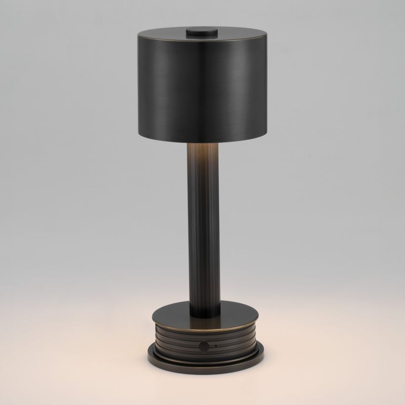 Our rechargeable Brisbane lamp adds useful illumination wherever you need it. The petite size fits perfectly on a bookcase, fireplace mantel or entryway console. Finished in black, the streamlined steel lamp pairs perpendicular ribbing—horizontal on the base, vertical on the stem—for a subtly linear look. A smooth drum shade tops the lamp, casting light downward. Shining for 15 hours on a full charge, the rechargeable table lamp features a touch dimmer switch to create just the right glow.