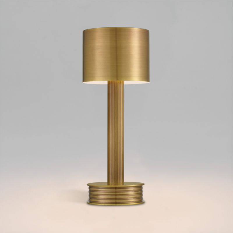 Our rechargeable Brisbane lamp adds illumination wherever you need it. The petite size fits perfectly on a bookcase, fireplace mantel or entryway console. Finished in polished antique brass, the streamlined lamp pairs perpendicular ribbing—horizontal on the base, vertical on the stem—for a subtly linear look. A smooth drum shade tops the lamp, casting light downward for a golden gleam. Shining for 15 hours on a full charge, the rechargeable table lamp features a touch dimmer switch to create just the right glow.
