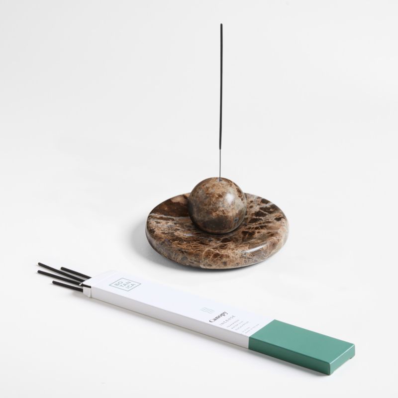 This set elevates the incense-burning experience with Emperador marble and premium essential oils. Talented artisans polish and finish each dark brown marble incense holder by hand, showcasing the fascinating complexity of the stone. The sphere holds an incense stick upright while the round base catches ashes. Botanica's incense transforms a space into a luxuriously calm retreat. Infused with high-quality fragrance and essential oils, the Canopy scent fills the air with fragrances of warm teak, sweet water lily and refreshing eucalyptus. This set makes a thoughtful housewarming gift or addition to a spa-themed basket.