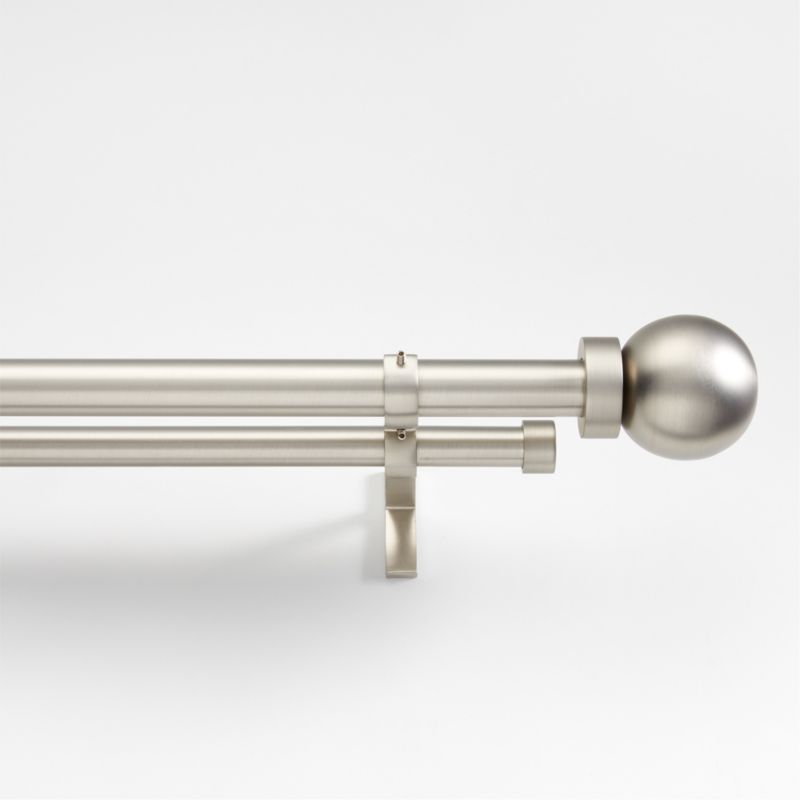 Our brushed nickel two-tier curtain rod set hangs both panels and sheers for a layered look, adjusting easily to your preferred levels of light and privacy. Simple yet statement-making, subtly shining spheres punctuate your drapery with clean geometry, adding crisp definition to the slim curtain rods and understated brackets. This double curtain rod set includes telescoping rods, brackets and mounting hardware, all finished in brushed nickel. Complete your window dressing with our coordinating curtain rings and tiebacks (sold separately).