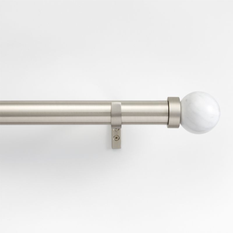 Show your curtains off to their best effect with this modern-classic set. Simple yet statement-making, spheres of white marble round out your drapery with a luxe finishing touch, adding organic beauty to the sleek curtain rod and understated brackets. This curtain rod set includes a telescoping rod, brackets and mounting hardware, all finished in brushed nickel. Complete your window dressing with our brushed nickel curtain rings and tiebacks (sold separately).