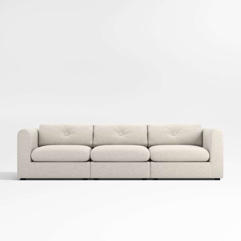 As cool and casual as its namesake Chicago neighborhood, our Bucktown sectional invites the whole family to curl up and snuggle in. Propped on a thick deck, the sectional sofa's rounded seat cushions sit deep, plush and loungey. Toss off the back pillows and it's deep enough to sleep an overnight guest. And because it's a Crate & Barrel exclusive, Bucktown delights with attention-getting design details such as oversized button tufting on the back pillows and the waterfall construction that grounds the modular sofa in contemporary curves. The three-piece sectional consists of an armless chair and left- and right-arm chairs.