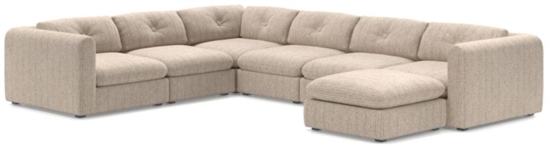 As cool and casual as its namesake Chicago neighborhood, our Bucktown sectional invites the whole family to curl up and snuggle in. Propped on a thick deck, the sectional sofa's rounded seat cushions sit deep, plush and loungey. Toss off the back pillows and it's deep enough to sleep an overnight guest. And because it's a Crate & Barrel exclusive, Bucktown delights with attention-getting design details such as oversized button tufting on the back pillows and the waterfall construction that grounds the modular sofa in contemporary curves. The seven-piece sectional consists of an ottoman, three armless chairs, a corner and right- and left-arm chairs.
