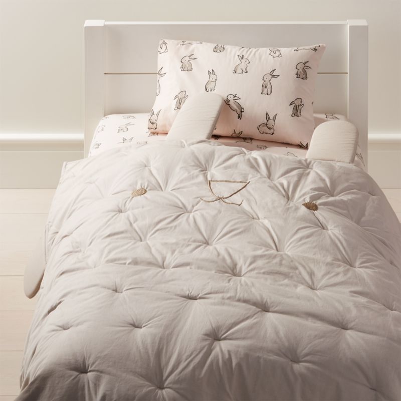 It's time to hop on a Bunny Toddler Bedding set like no other. The Toddler Sheet Set features a light pink base with all over bunny print, and the Baby Quilt features an embroidered bunny face, ears, arms and fluffy tail on back.