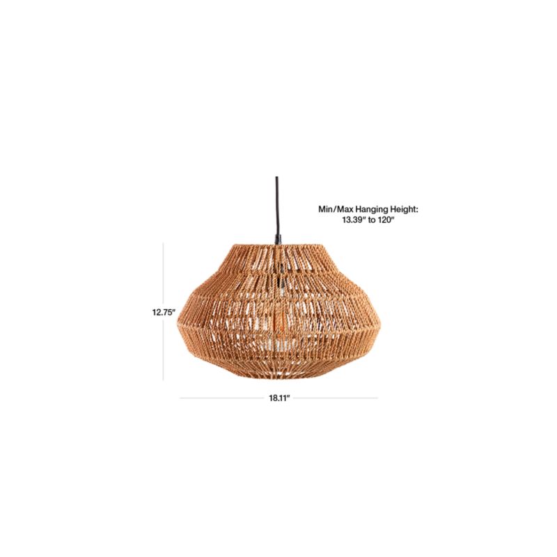 Natural rope weaves a small pendant light with a touch of the tropics. Brown rope loops in a zigzag pattern over a neutral metal frame to shape an angled bell shape. The chunky fiber and loose weave allow light to filter through, creating bright and diffuse illumination. Show off your favorite display-worthy light bulb, or choose an understated bulb to keep the focus on the natural material and modern organic shade. Our small Cabo woven pendant light is a Crate and Barrel exclusive.