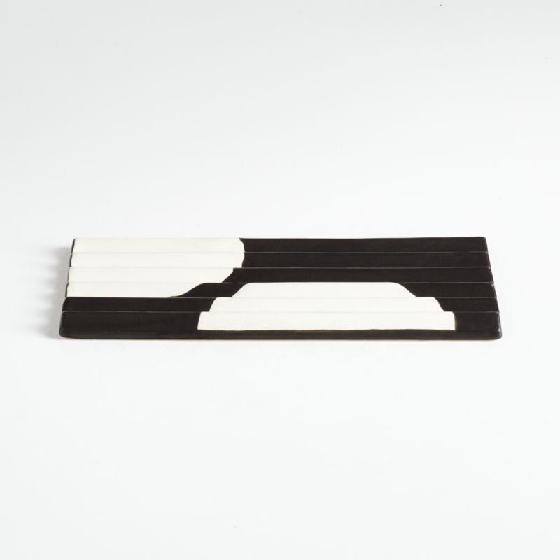 Cachuma catches the eye with its mod graphics as it parks office supplies and household items. Decorated with large rounded shapes on black, the ceramic tray has a unique ridged design that lets eyeglasses, jewelry or other objects rest on the surface. Or you can nest pens, pencils and clips in the indentations. Striking and practical, the Cachuma small decorative tray is a Crate and Barrel exclusive.