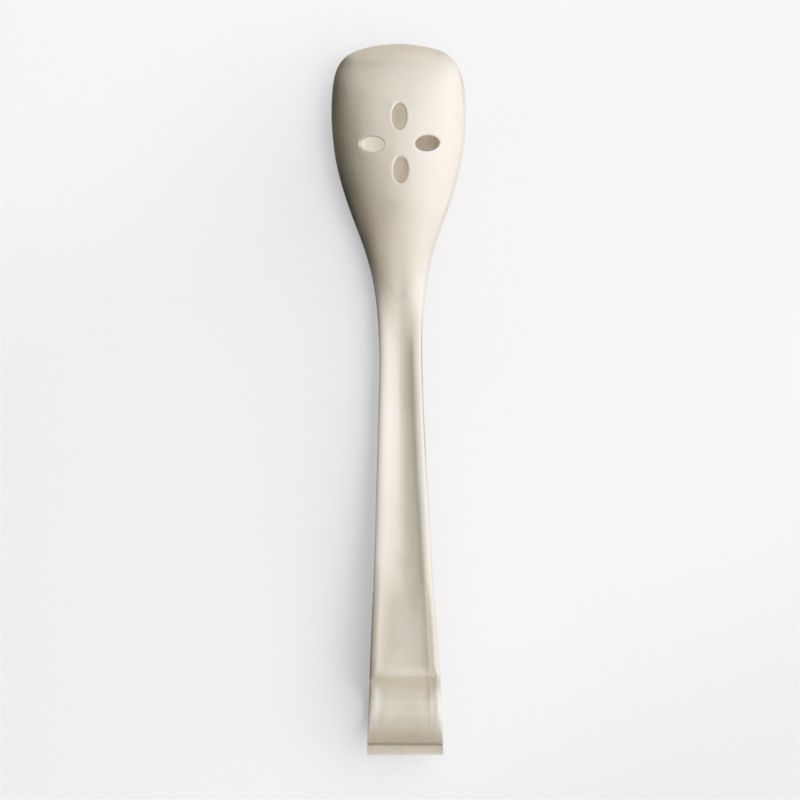 Designed by Robert Welch Designs in the English Cotswolds, these classically styled serving tongs with well-balanced, comfortable heft and a soft, satin finish is a much-anticipated addition to our Caesna collection of flatware and individual specialty serving pieces. Use the tongs to distribute cuts of roasted meat, slices of bread and all types of salads. Petal-like perforations on one side allow liquids to drain, while a clawed edge on the other provides a sturdy grip. Our Caesna satin serving tongs are a Crate and Barrel exclusive.