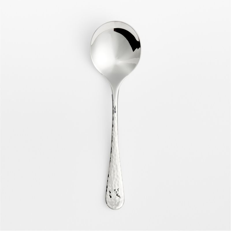 We've updated our bestselling Caesna flatware with touchable texture that reflects light beautifully. This round soup spoon by Robert Welch is versatile enough to complement any table setting, suiting everyday meals as well as festive feasts. We love the way the hand-finished textured handle evokes rustic, hammered metalworking while also adding sparkle to formal place settings. Well-balanced, weighty and comfortable in hand with softly rounded handles, our exclusive Caesna utensils and serving pieces are modern classics.